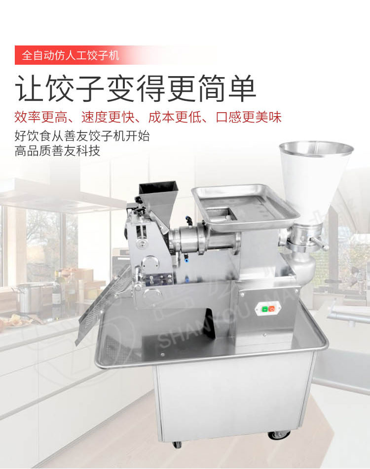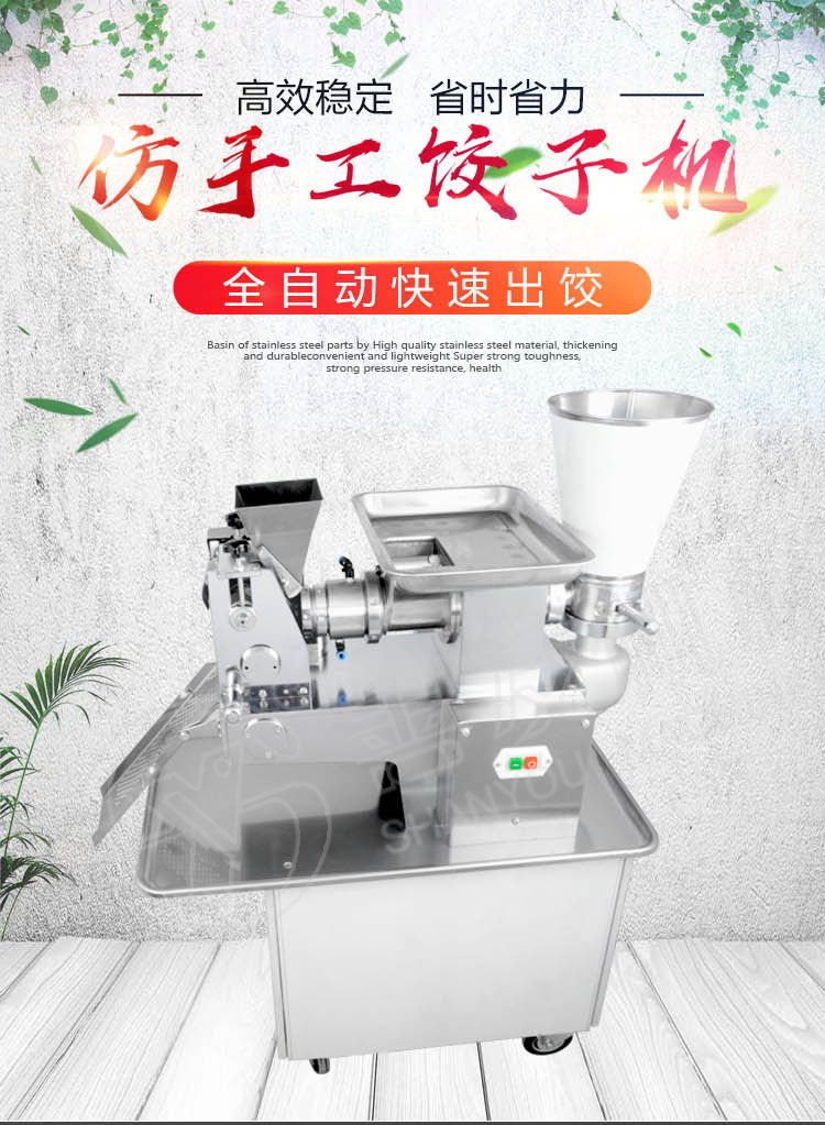 2. 面皮厚度与馅量可调整。 3. 适合多种调理: 包制出来的饺子可蒸、煮、炸、煎。春卷与咖喱角与咖喱卜油炸尤其可口。最重要的是均适合急速冷冻、耐贮藏,是理想的微波炉食品。 4. 操作简便省时省力: 人工制造饺子、春卷、锅贴、咖喱卜、咖喱角,耗时费工,尤其目前在劳工严重缺乏的情形下,更是令大多数的老板烦恼不已,这台机械操作简便,无经验者也可操作。制造速度快,不但省时而且省力。 5. 完美的设计,同时兼顾卫生与美观两大优点。 6. 拆装容易、清洗简便。 7. 结构精巧占地小: 机械尺寸: 990(长)×470(宽)×1150(高)毫米。重量:150公斤。 8. 产量高: 饺子:3,000-6,000个/时 春卷:1,500-3,000个/时 锅贴:2,000-4,000个/时 咖喱饺:2,000-5,000个/时 SY-JZJ系列饺子自动成型机,本机适用于宾馆、饭店、餐厅、团体食堂加工、幼儿园、速冻饺子生产。各种肉馅、肉菜混合馅、全菜馅及其它种馅的饺子。 |